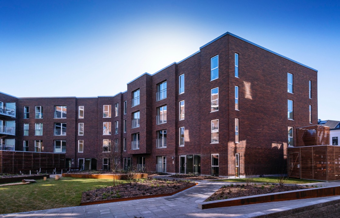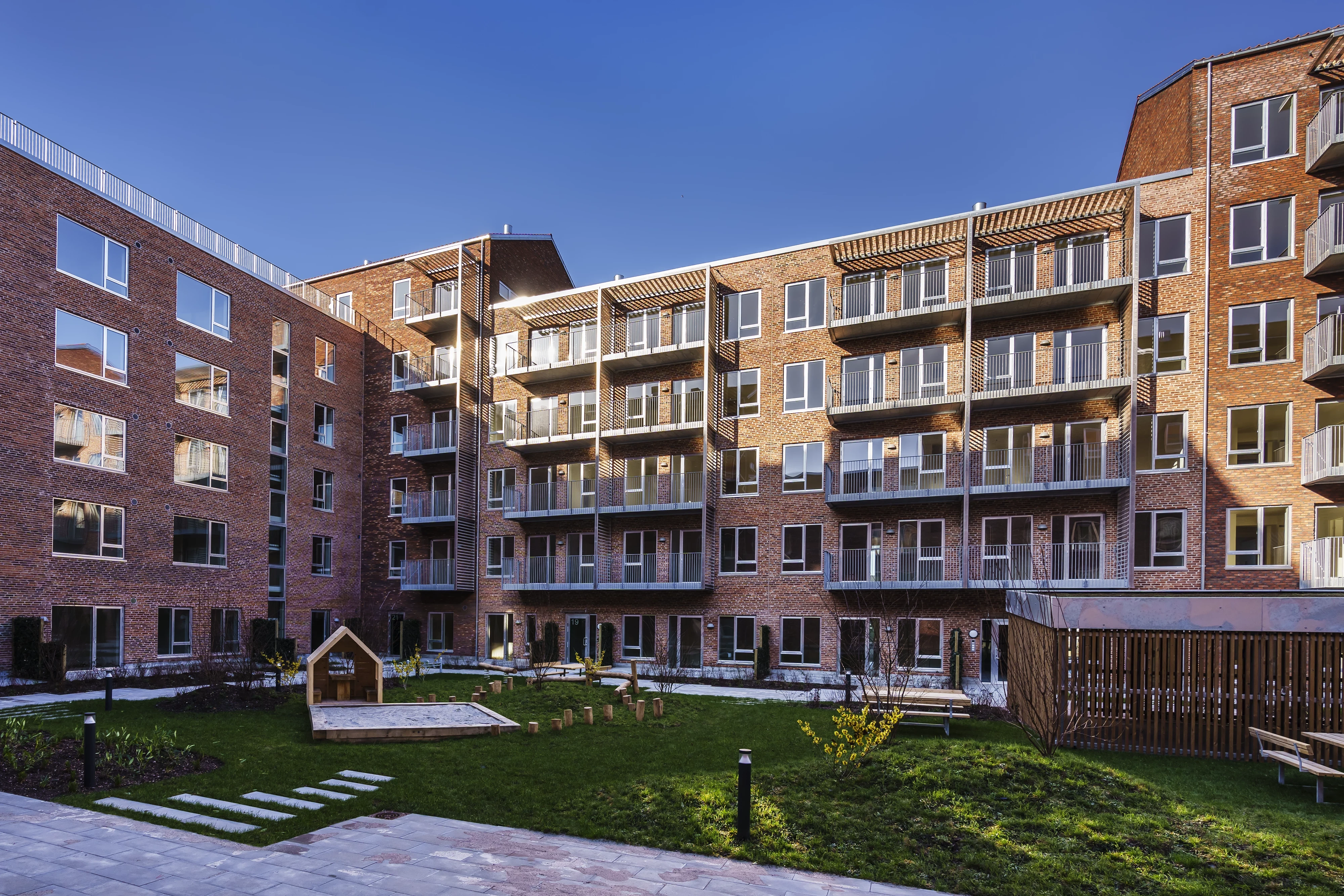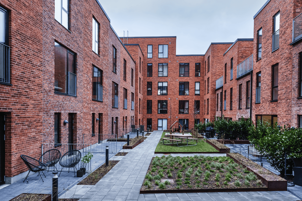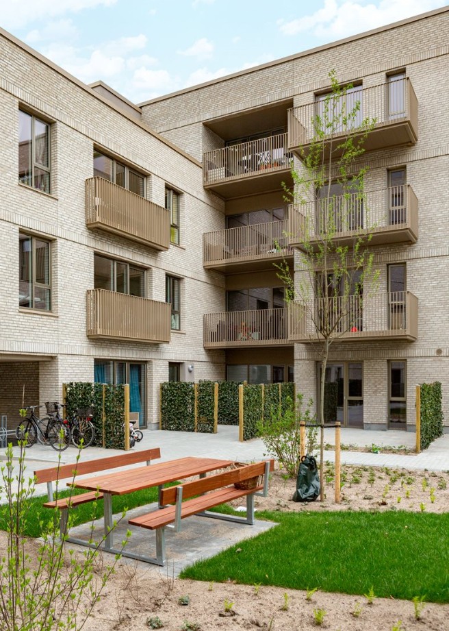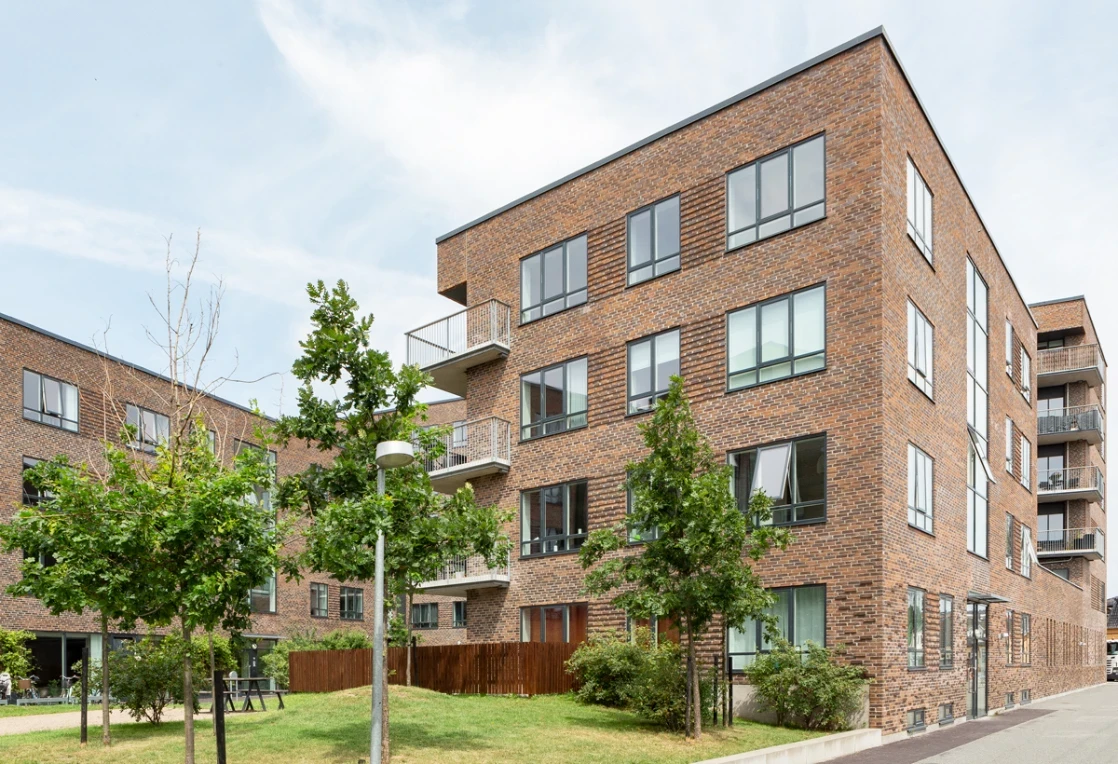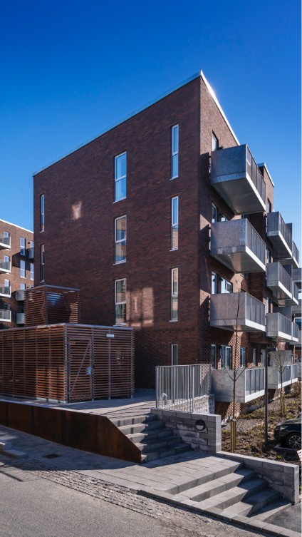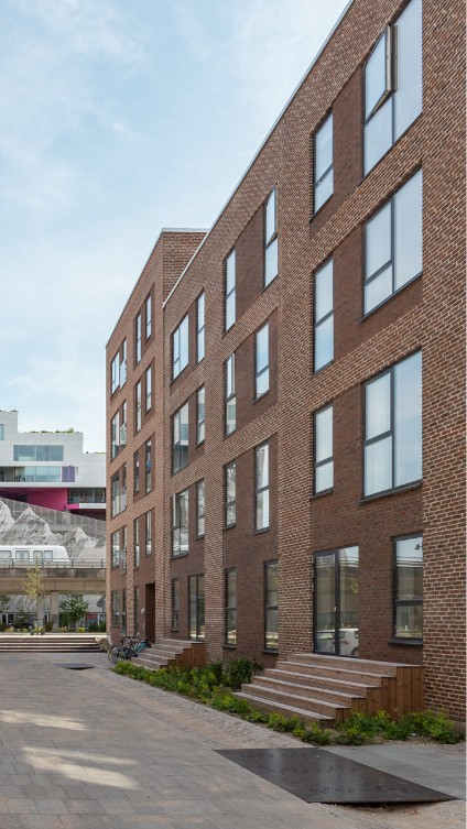 Opført i håndstrøgne teglsten med reference til dansk, traditionsrigt murstensbyggeri og udformet som en åben karré omkring et indbydende gårdrum.