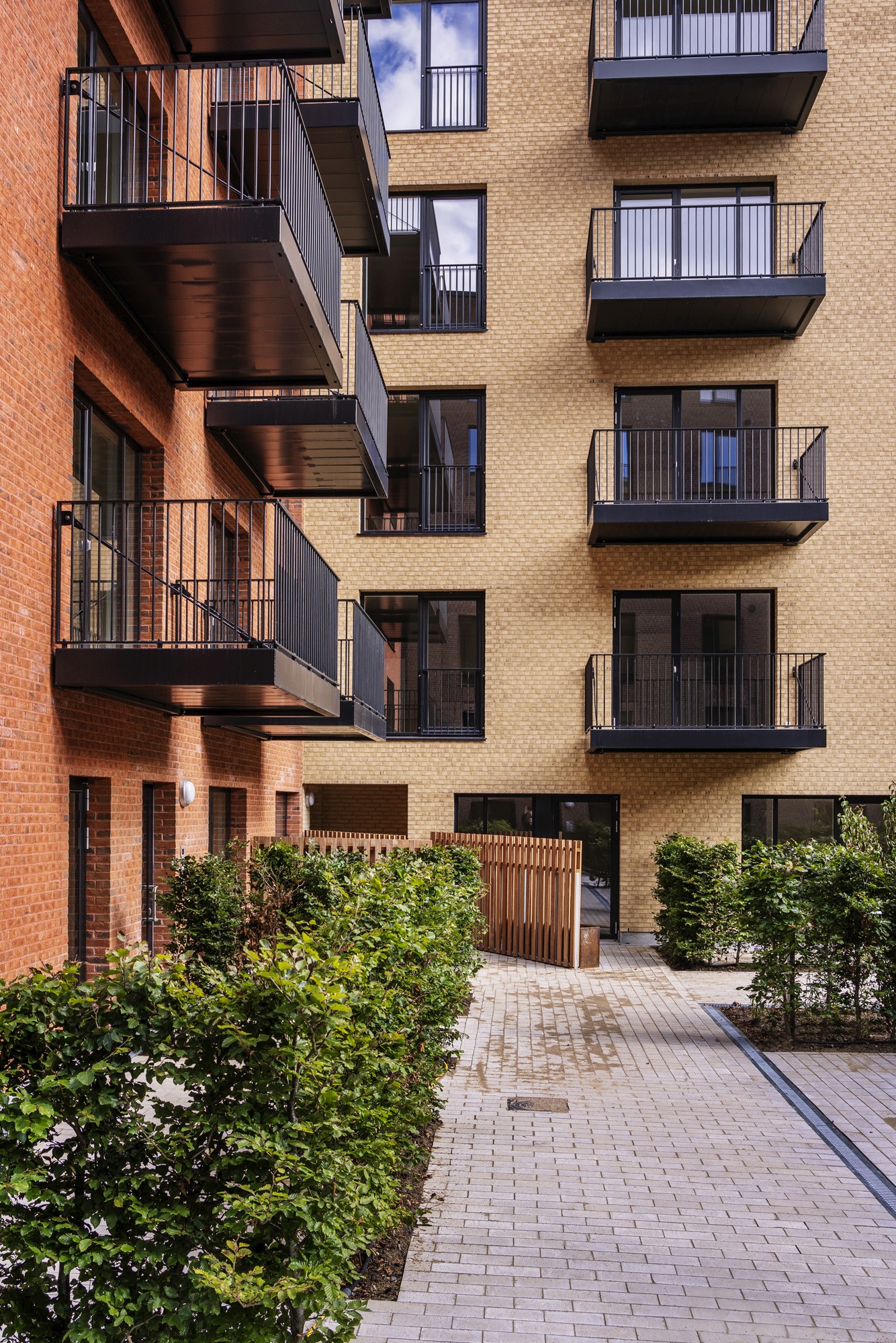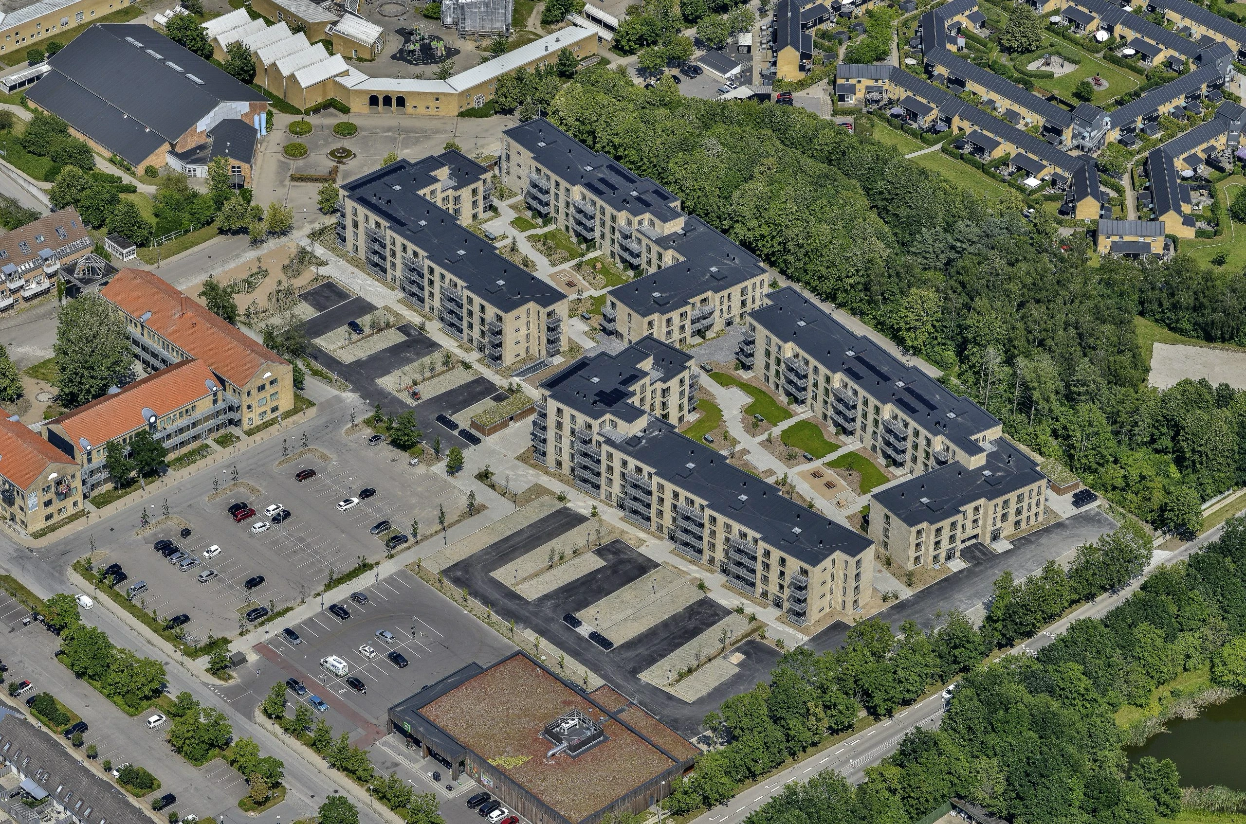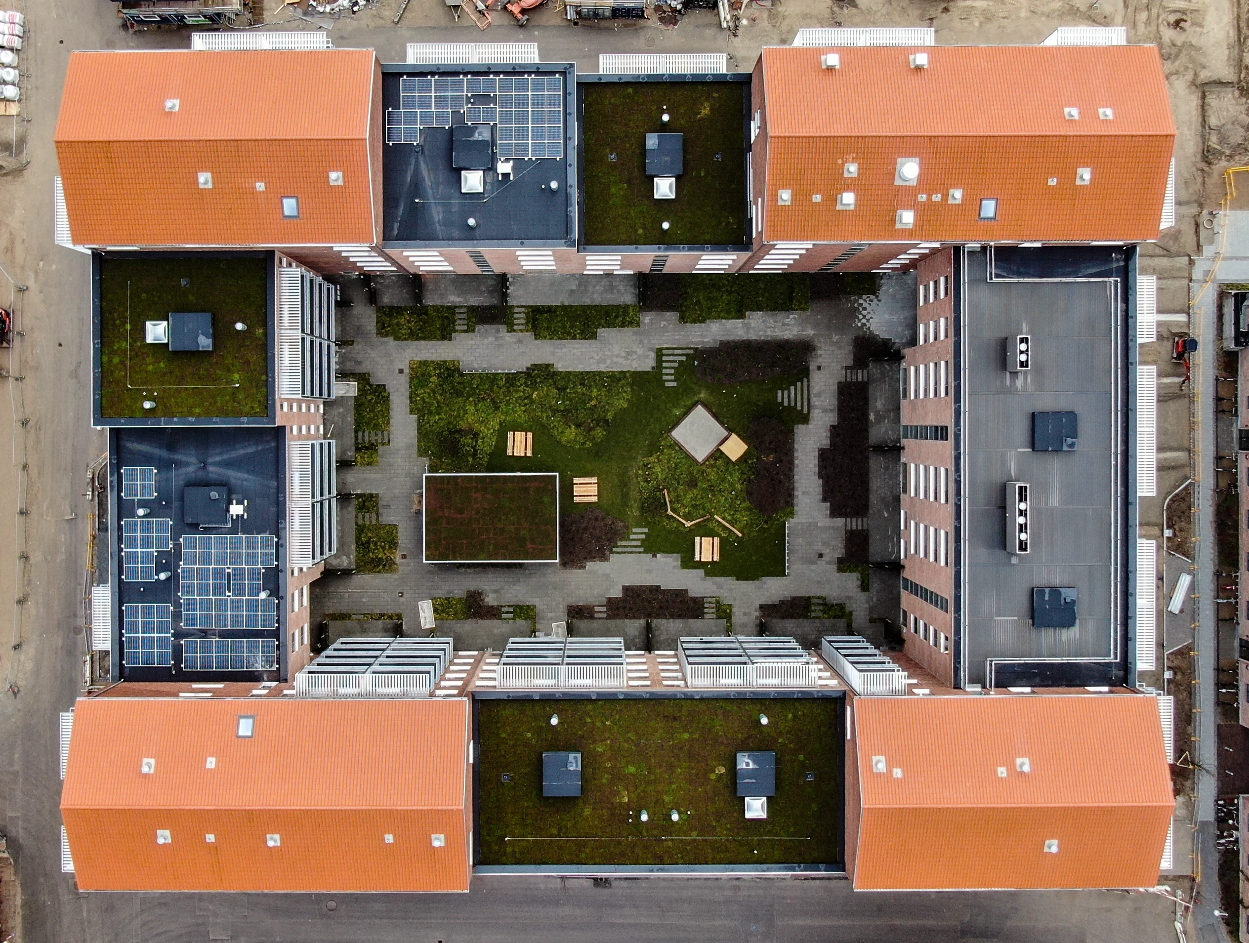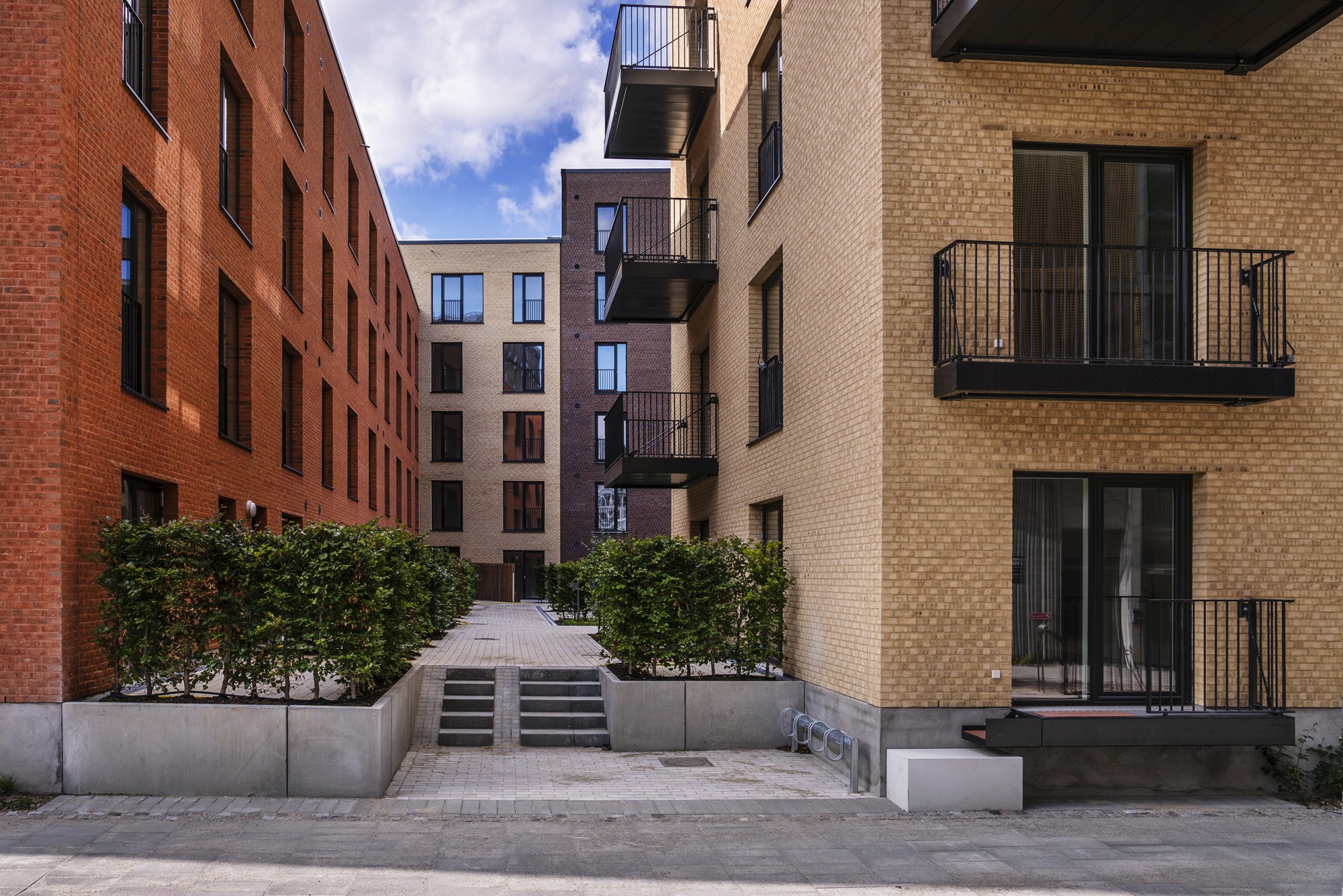 Opført i håndstrøgne teglsten med reference til dansk, traditionsrigt murstensbyggeri og udformet som en åben karré omkring et indbydende gårdrum.