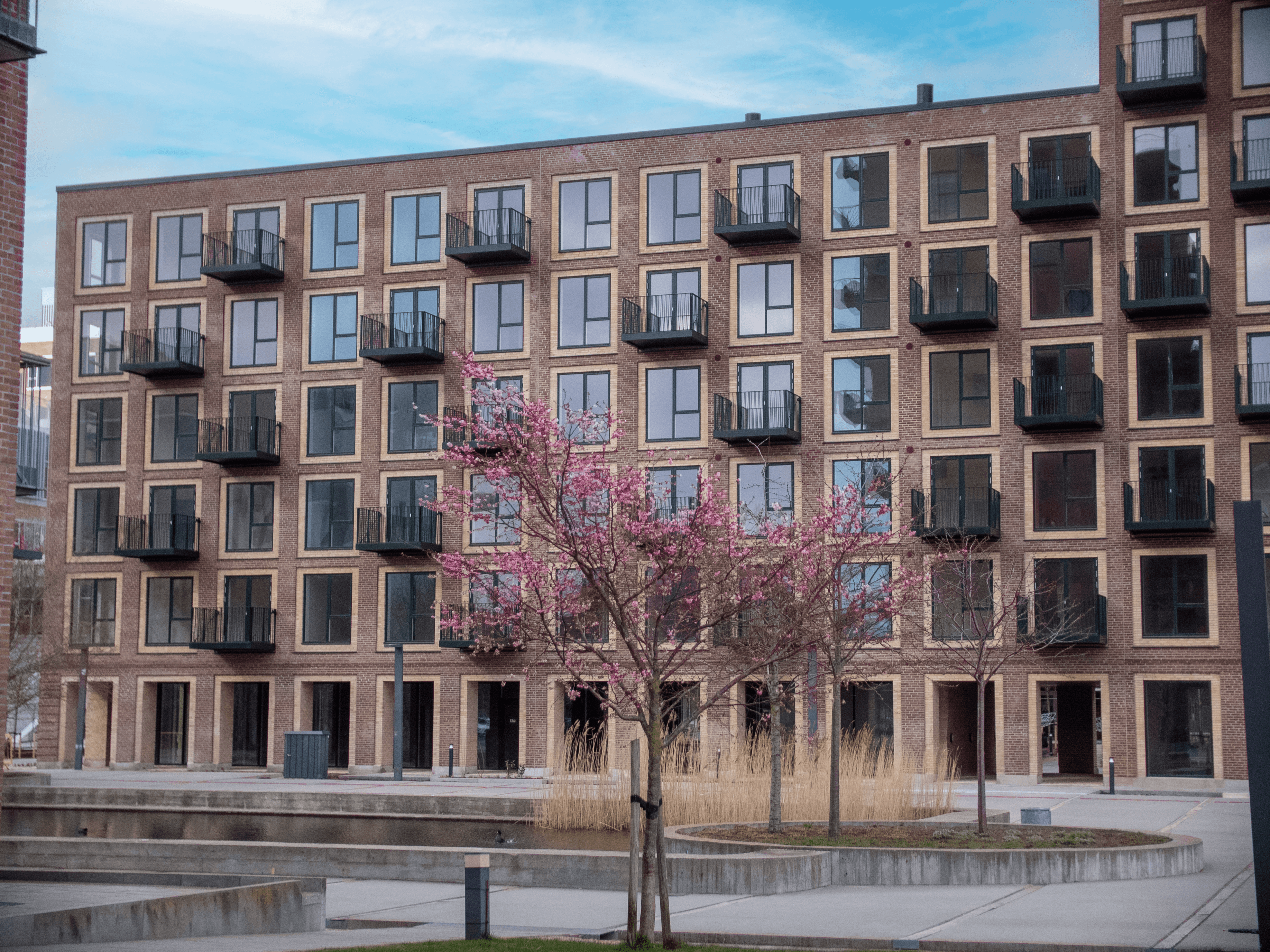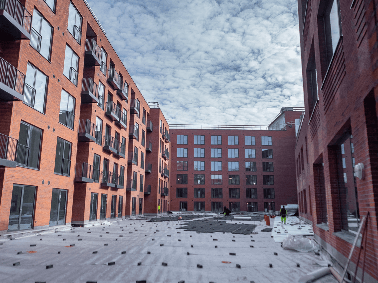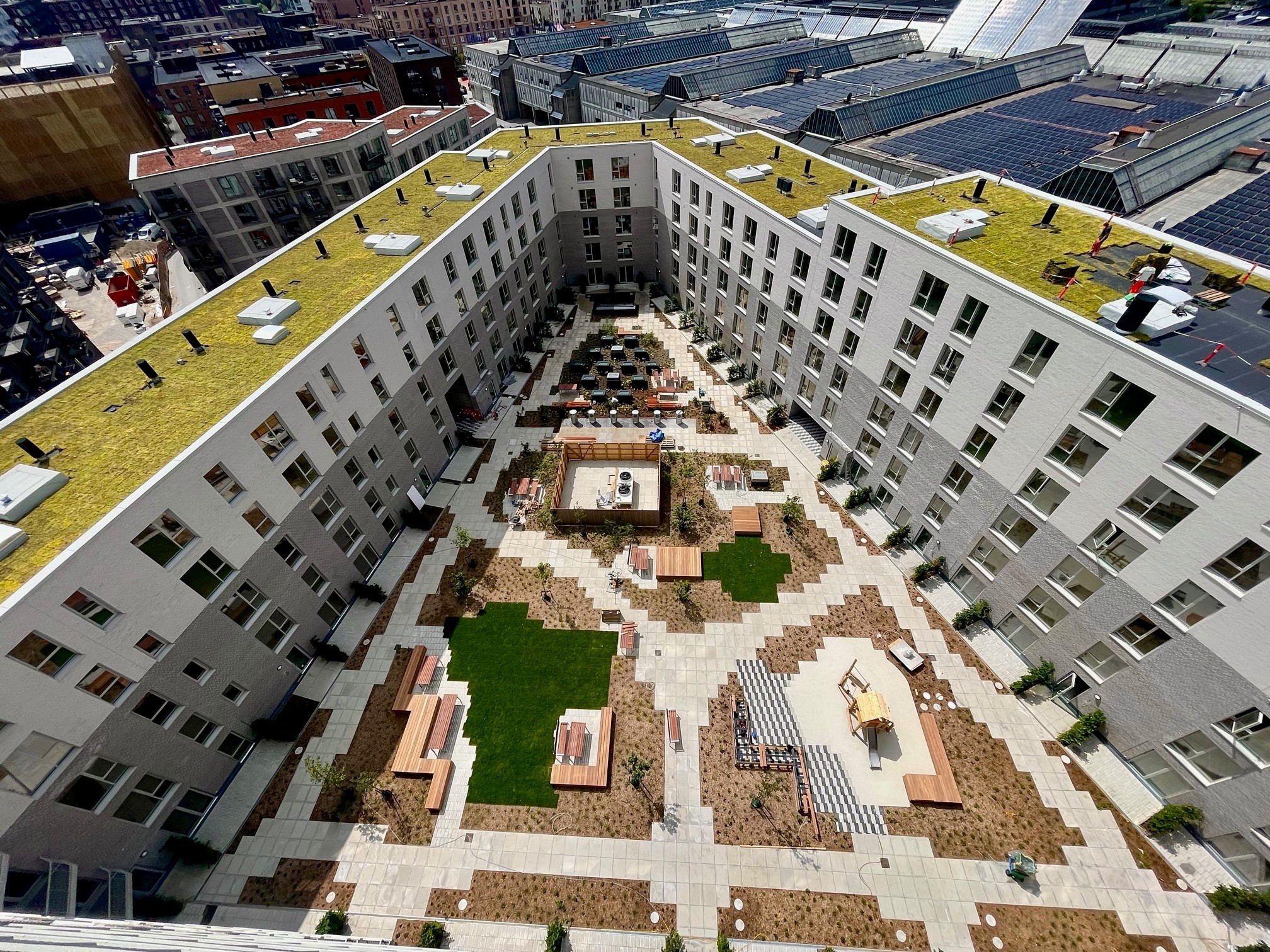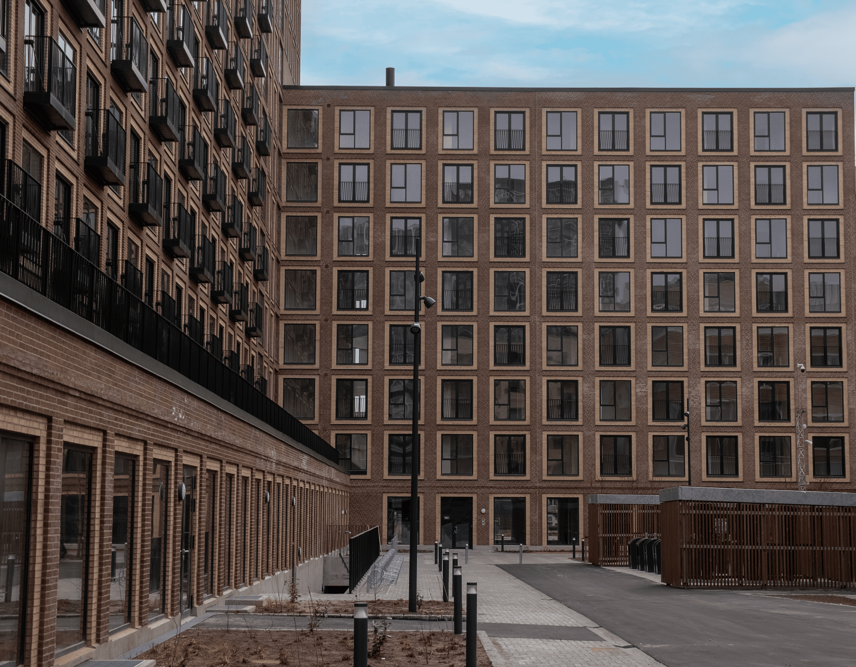 Opført i håndstrøgne teglsten med reference til dansk, traditionsrigt murstensbyggeri og udformet som en åben karré omkring et indbydende gårdrum.