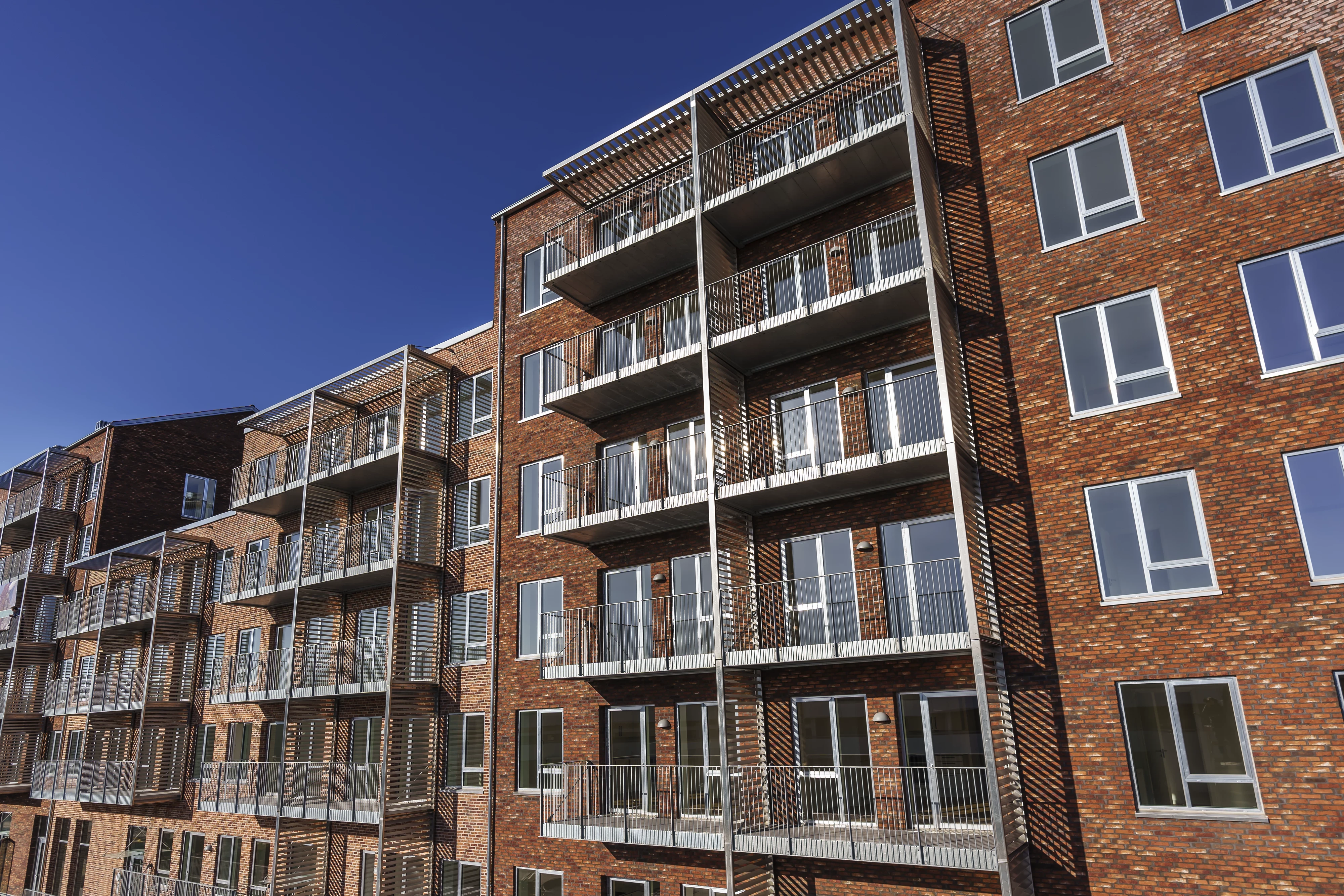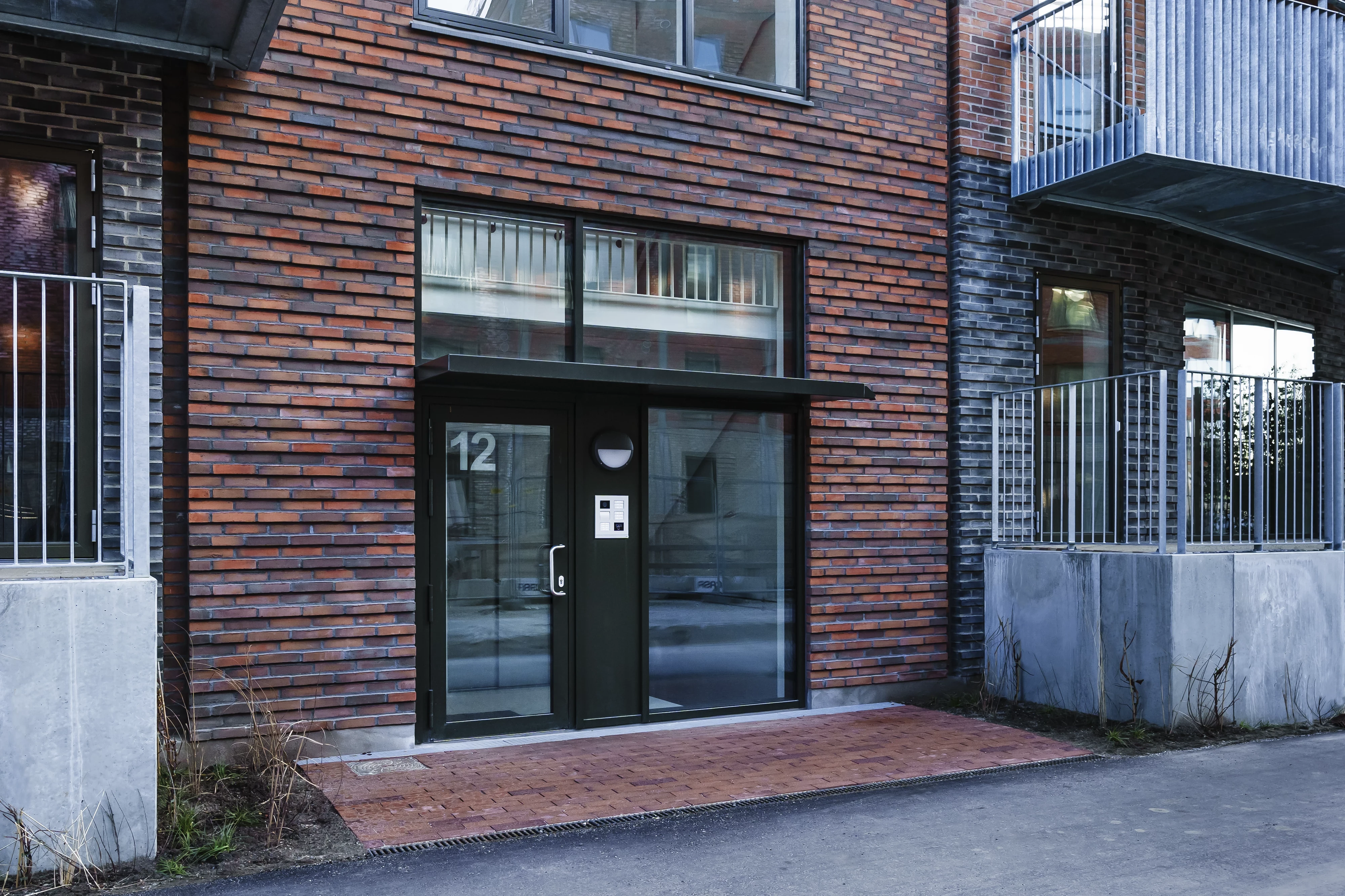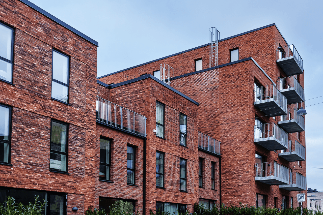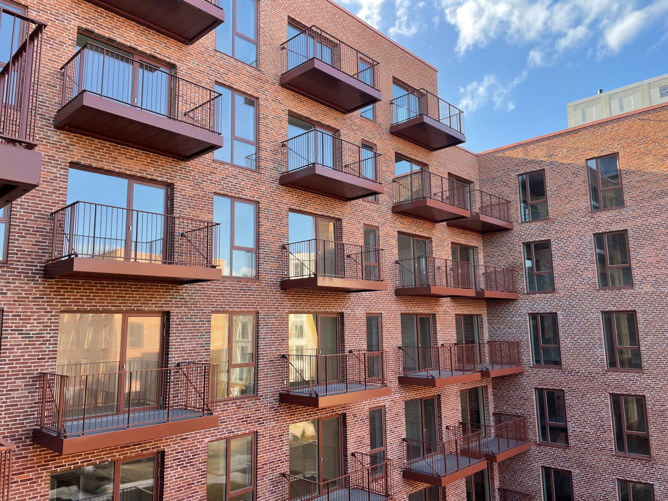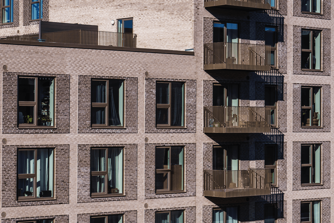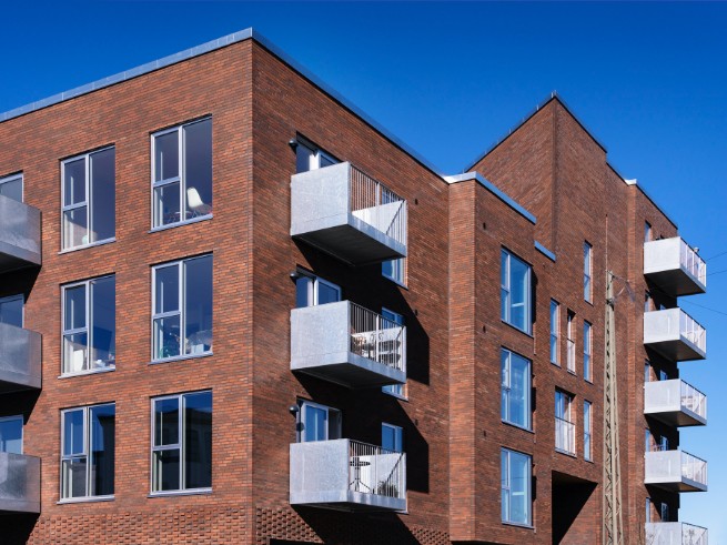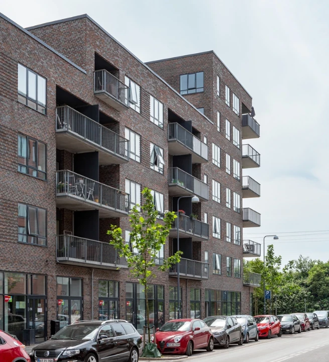 Ejendommen er opført i mursten, der tilfører et klassisk og modent udtryk, mens altanerne i matchende nuancer harmonerer med omgivelserne.