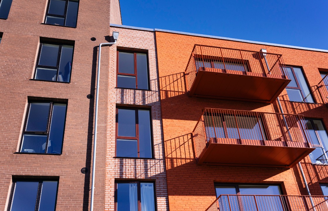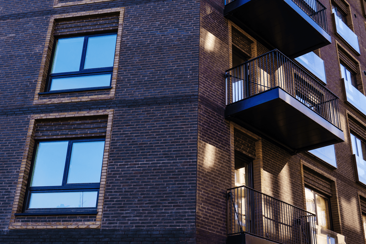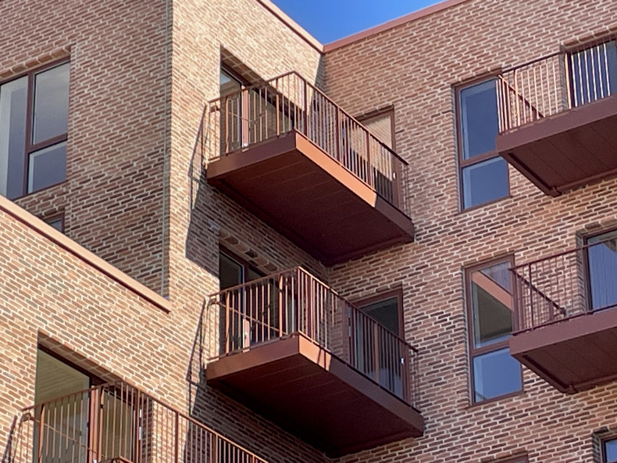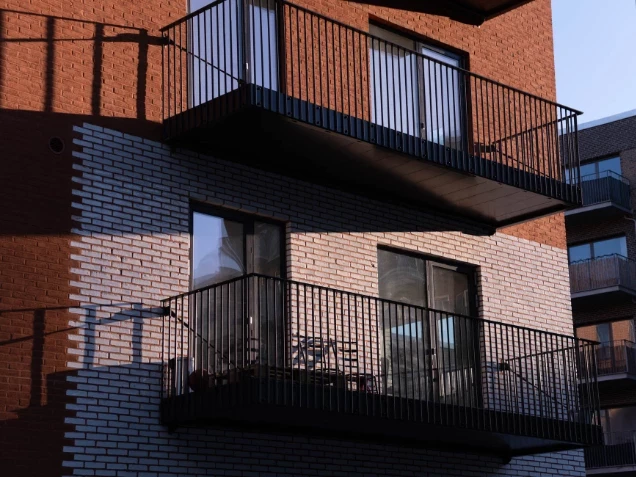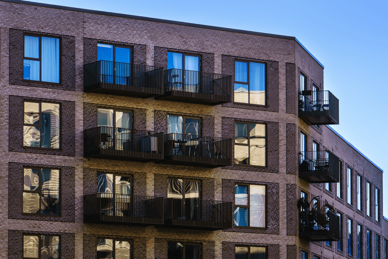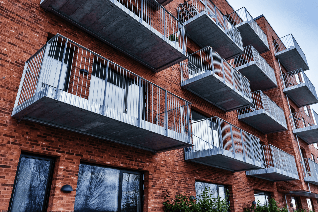 Ejendommen er opført i mursten, der tilfører et klassisk og modent udtryk, mens altanerne i matchende nuancer harmonerer med omgivelserne.
