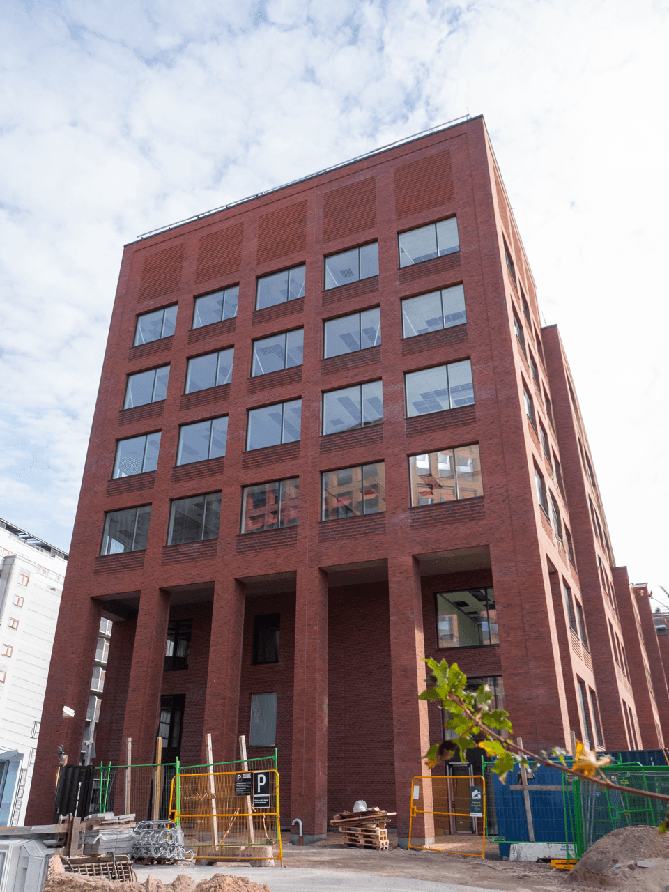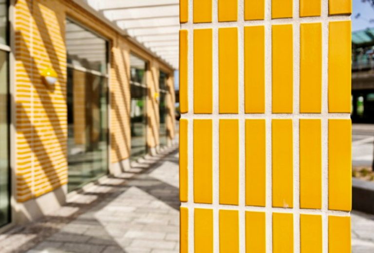 Facaderne er beklædt med gule og røde teglsten, med reference til klassisk,
