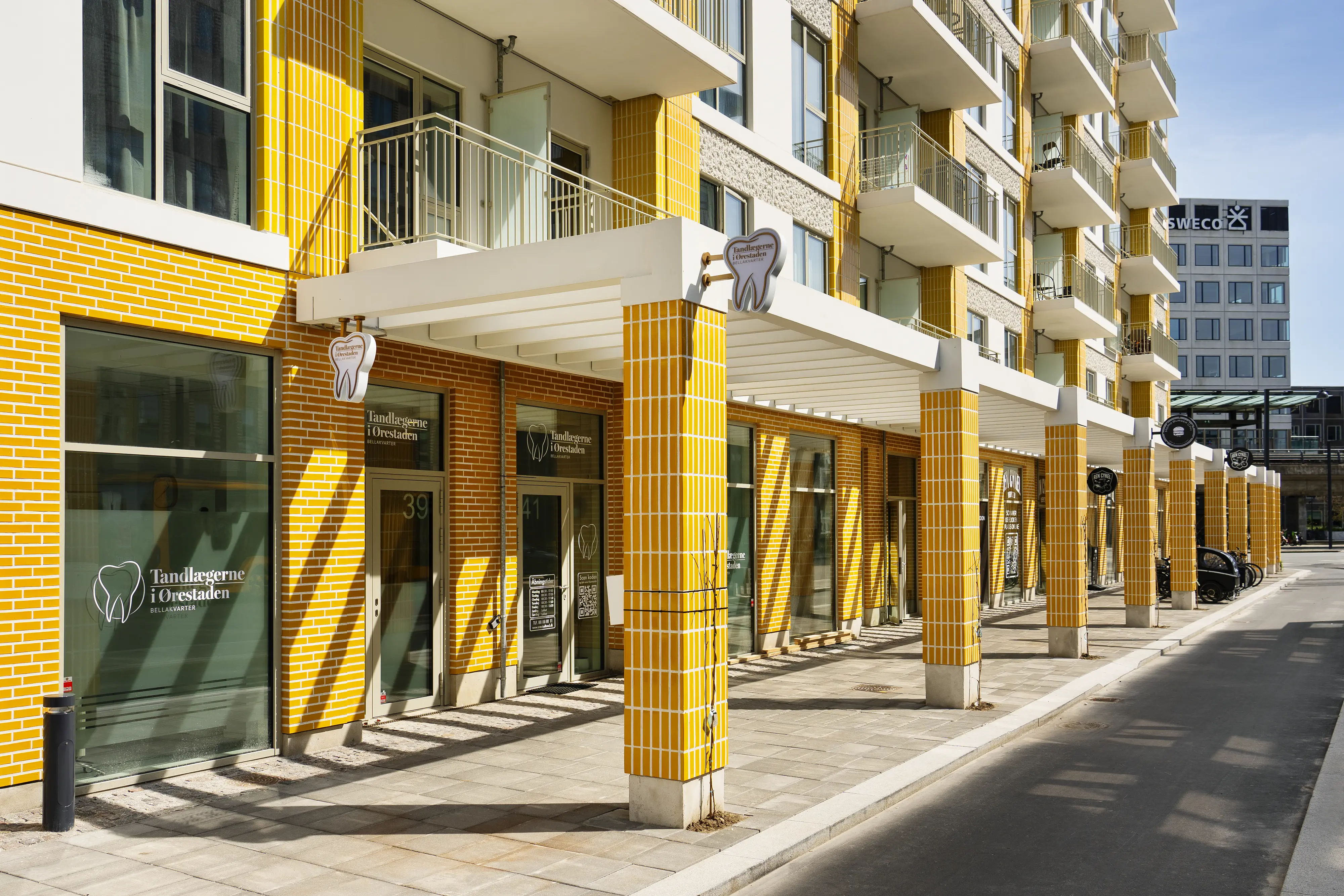københavnske ejendomme. Facaderne markerer sig med flotte, gule, glaserede mursten, der bliver lysere mod himlen og bidrager til, at lyset ledes ned i byrummet.