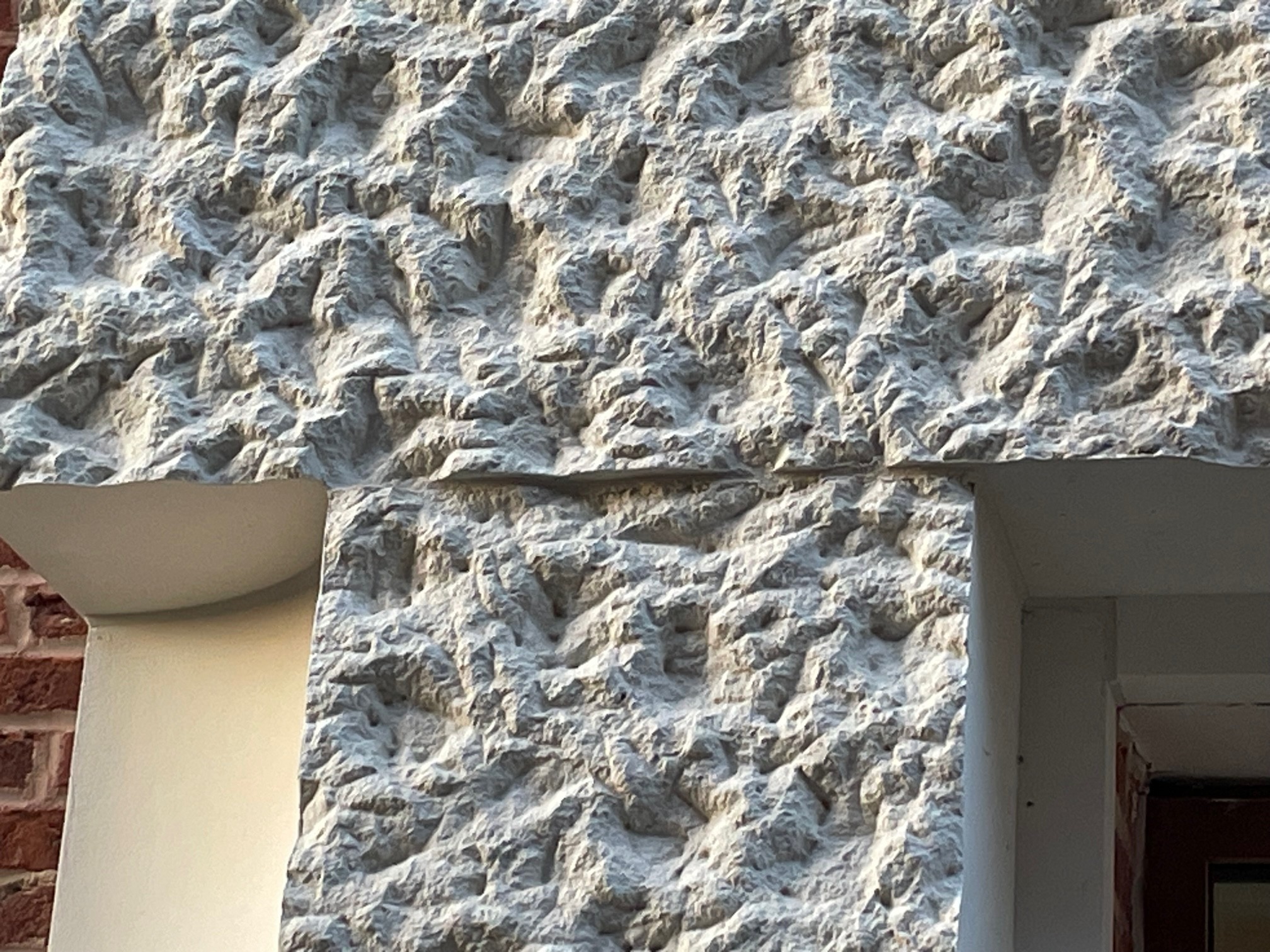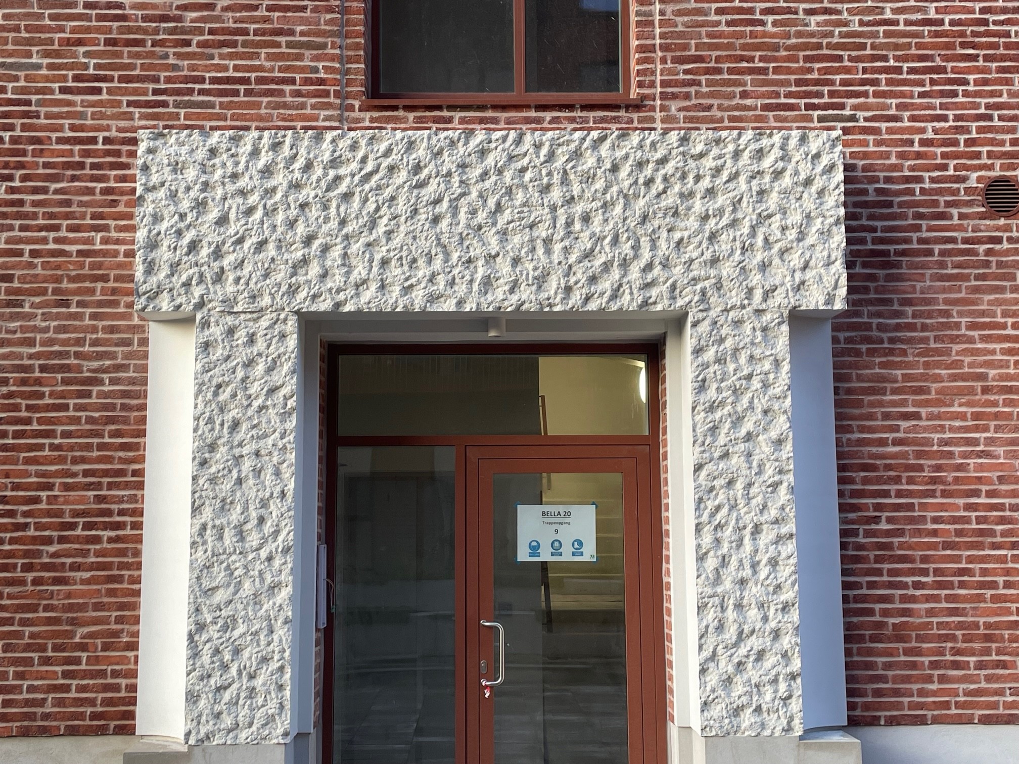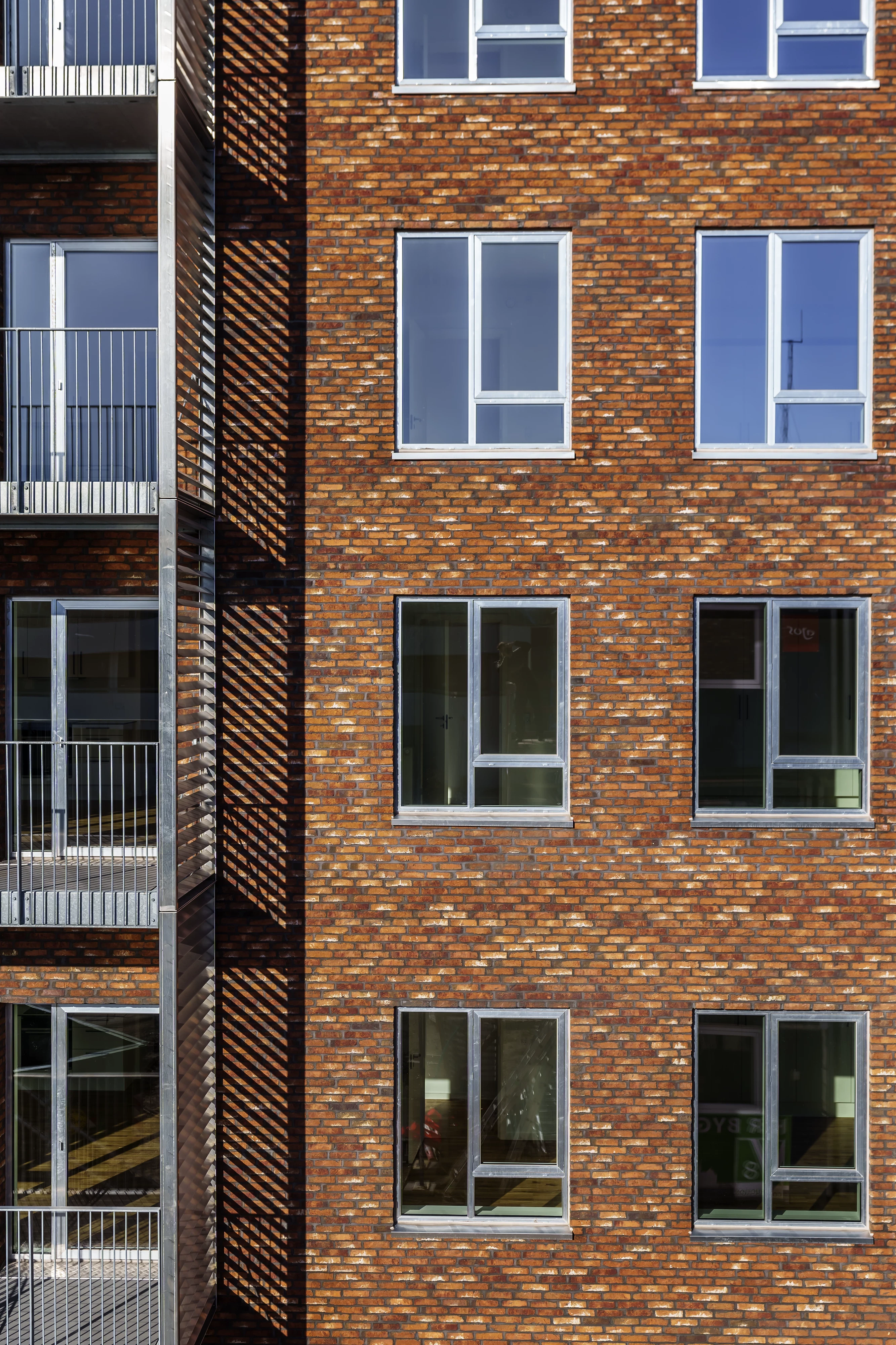 Facaden er lavet i lyse, sandfarvede mursten suppleret af en geometrisk variation af kontrast-farvede rammer i brune og grå nuancer omkring vinduespartierne.