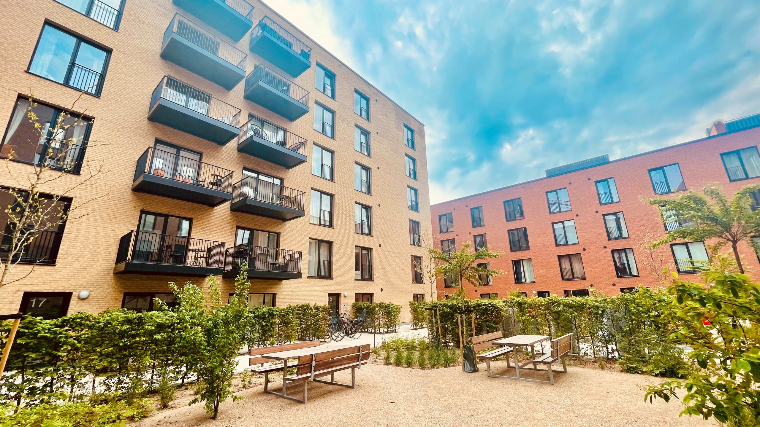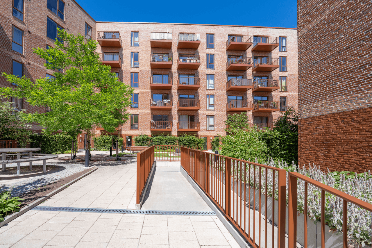 Bor du i stueetagen, har du din egen terrassehave, der vender ud til det grønne gårdmiljø. Den store, grønne gård er et perfekt supplement til de flotte, maritime omgivelser. Her er trygt for børnene at lege, og de voksne kan tage sig en pause fra det livlige miljø på havnen.