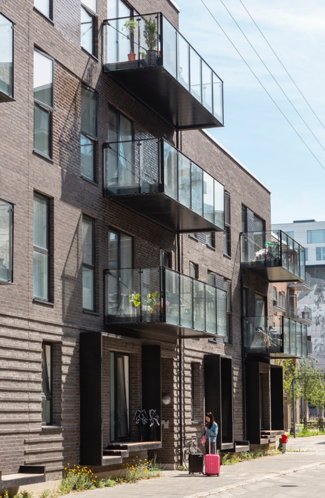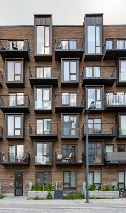 Facaderne udføres af lækre håndstrøgne mursten i forskellige farver, facaderne designes med galvaniserede altaner til alle lejligheder, vinduer og døre er udført i rå aluminium.