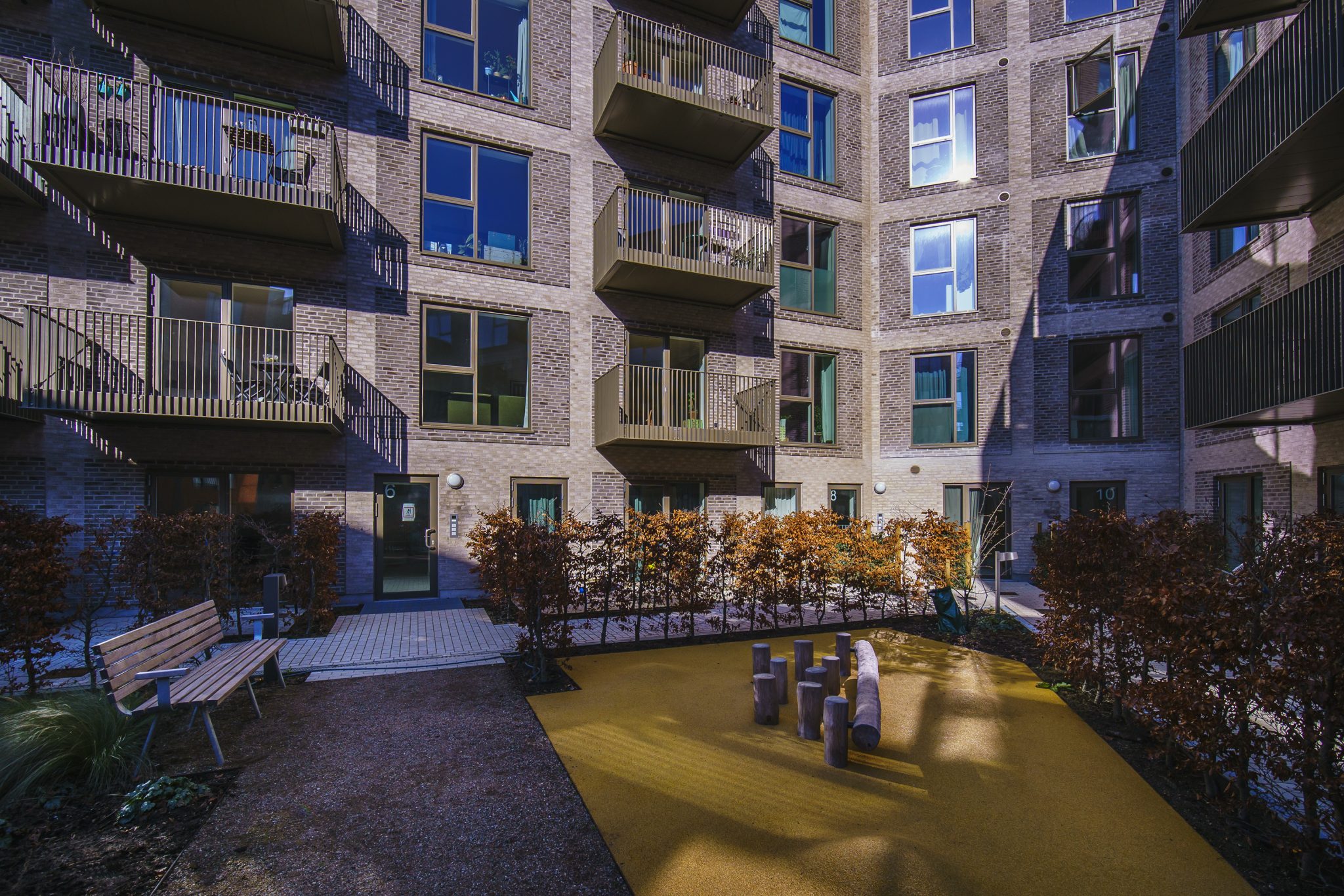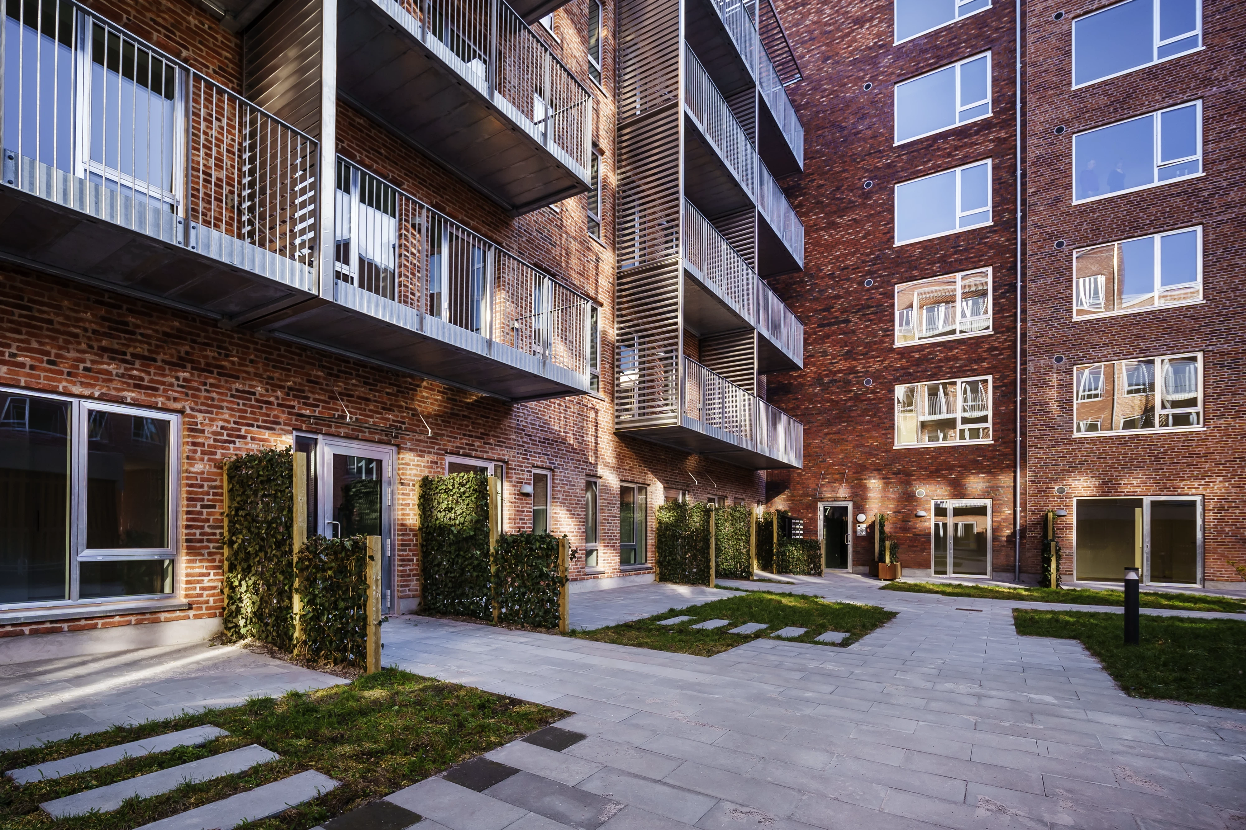 Bygningen er lavet i et planprincip, hvor lejlighederne både er veldisponerede og gennemlyste, så der opnås en høj dagslyskvalitet i døgnets lyse timer. Samtidig er der fokuseret meget på udemiljøerne.