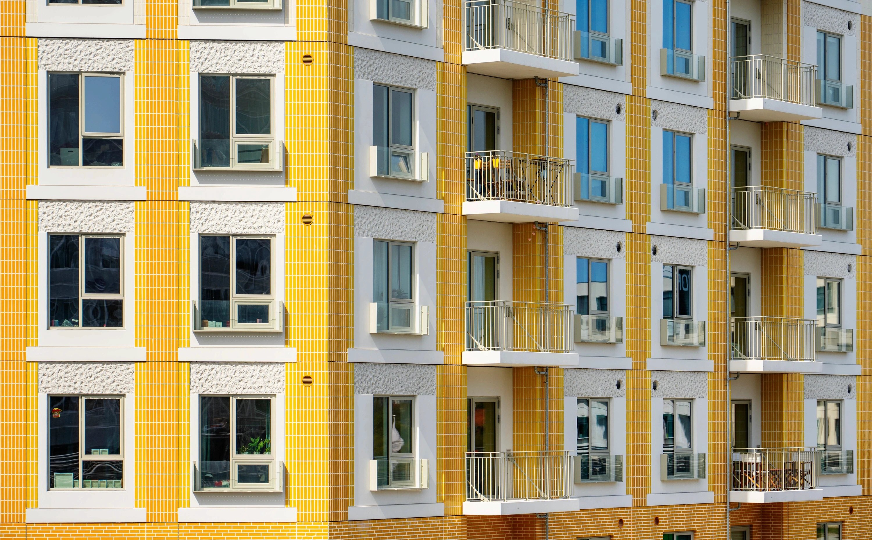 Facaderne er beklædt med gule og røde teglsten, med reference til klassisk, dansk byggetradition. Vinduesrammerne er indrammet med tegl i kontrastfarver, som tilføjer karakter og dybde til facaden.