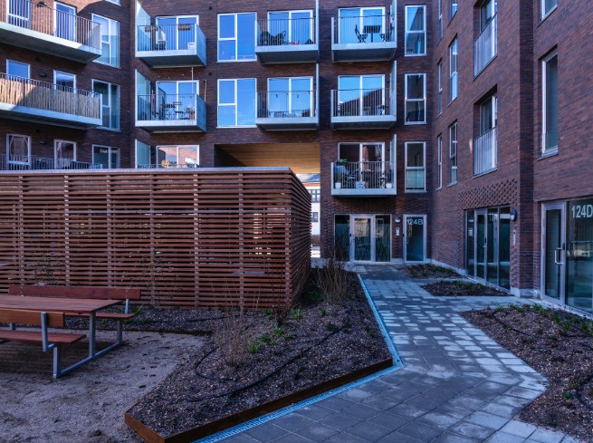 De grønne udearealer er indrettet med beplantning og opholdsrum, der understøtter både hverdagsliv og fællesskab.
