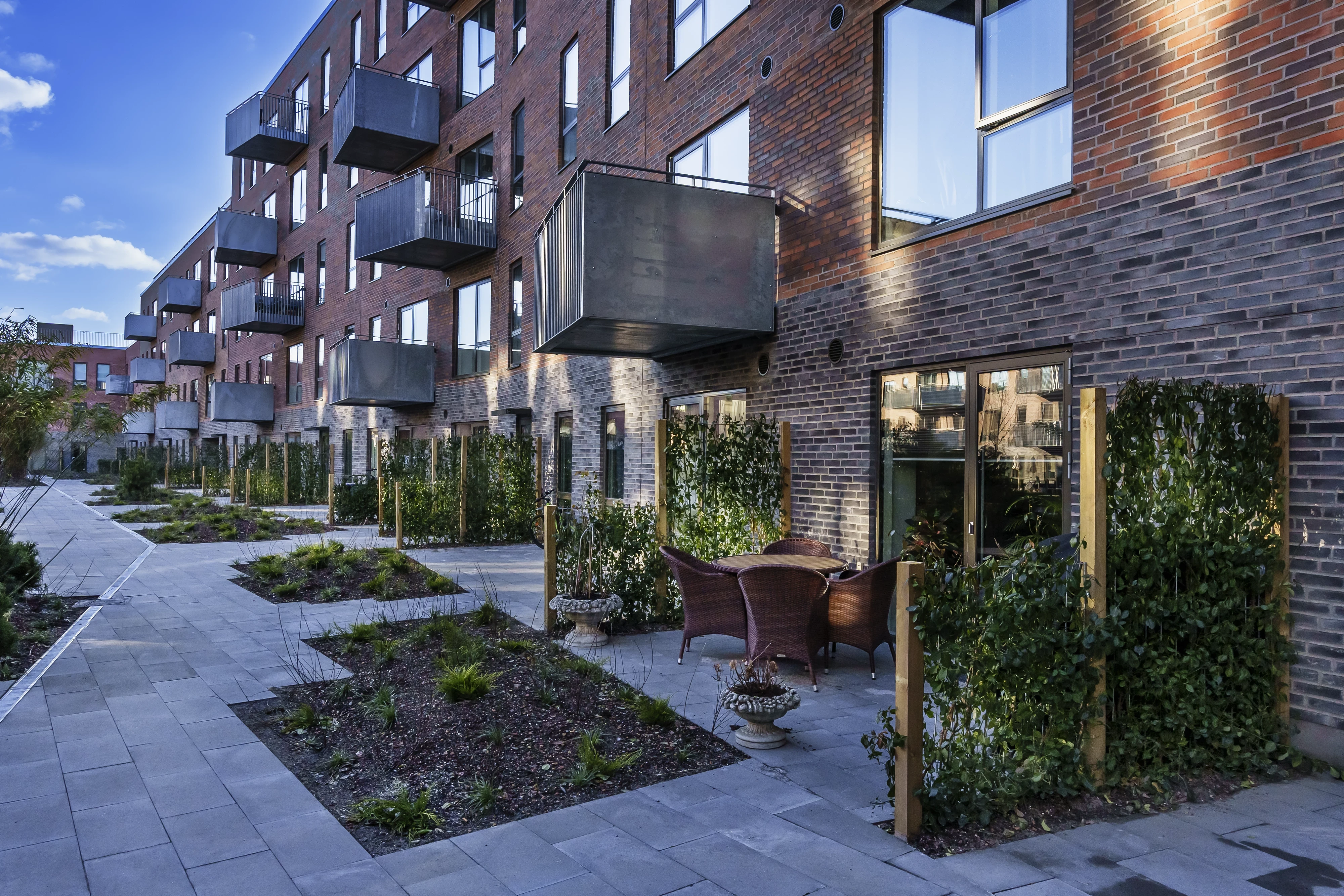 Alle boligerne har sit eget private uderum i form af en fransk eller almindelig altan, så boligen kan åbnes helt op.